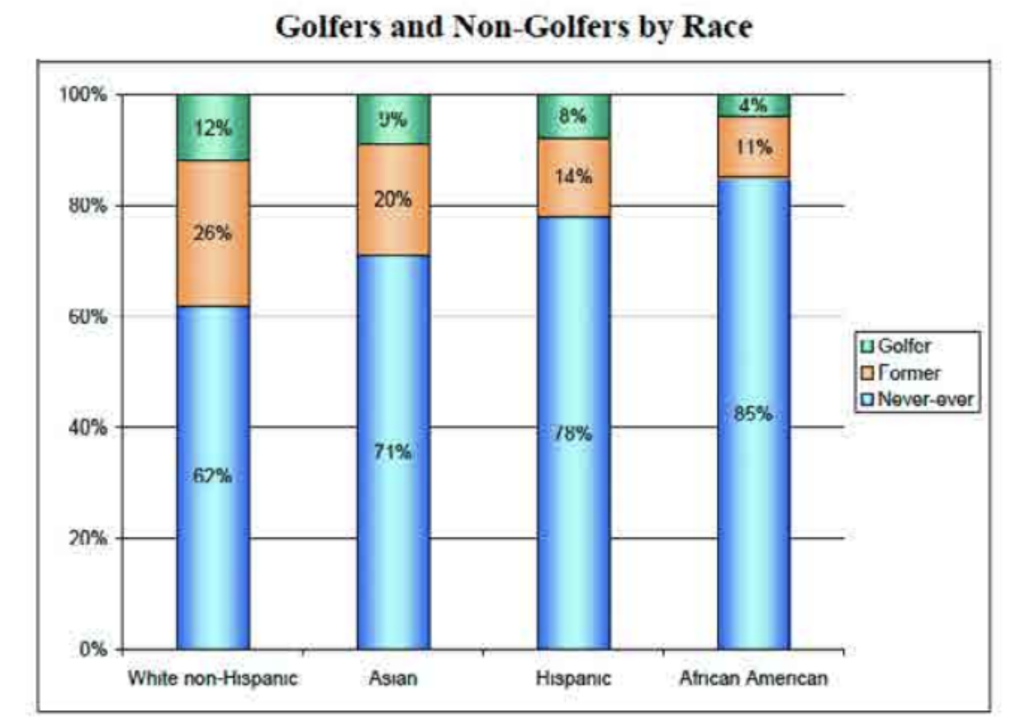 Golf participants have historically been disproportionately white, wealthy, and male. There are substantial differences in the golfing population compared with the total U.S. population, only 24% of all golfers are women (50.8% of total population), and only 19% of all golfers are non-white (28% of the total population). In the TCMA (Figure 1), it is predicted that white population will not grow in the next 30 years while other demographic categories will grow substantially. If the golf industry wants to be sustainable long-term, it needs to engage these demographics. Currently, non-white demographics are not as exposed to golf as the white population (Figure 2). Developing alternative programming and multiple uses of the golf course will increase the reach of the golf course and engage populations that may not have the opportunity to experience golf otherwise.