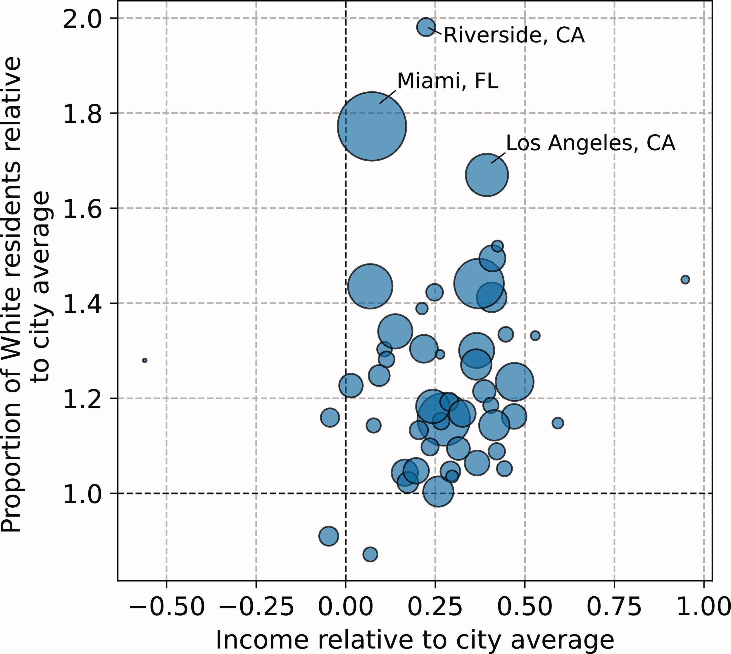 Characteristics of people who live within 1 km of a golf course, but further than 1 km from other types of greenspace for the fifty largest cities in the United States by population. The size of the circles represents the number of people. Overall, people who live near golf courses but far from other types of greenspace tend to be wealthier than and more often White the city average. Source: Ryan, J. C. (2023).